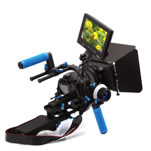 - Ce kit est un système complet et parfait permettre aux utilisateurs de reflex numérique / DV / HDV pour obtenir différents types de prises de vue pour faire des films commerciaux et professionnels à un coût beaucoup plus faible, il est composé par Rig épaule PAD Support mount, Matte Box M3 4x4, C Forme, Handle 15mm Rod Rig et HD moniteur portable de 7''.